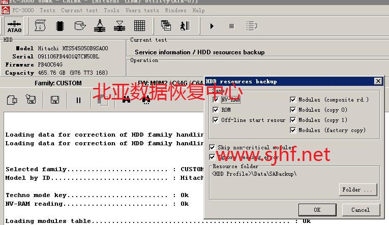 4、更换完成后将硬盘连接到专业工具后尝试进行加电操作,如果硬盘能够顺利就绪并且型号和容量识别正常后首先对硬盘固件做完整的备份,以备当现有磁头性能不良后硬盘状态不稳定后虚拟加载固件引导硬盘操作。