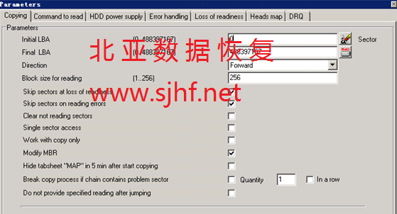 5、故障盘固件备份完成后使用数据镜像设备对故障盘所有扇区(或更换磁头前没有镜像的扇区)镜像镜像,在镜像过程中需要依据当前硬盘的状况调整不同的拷贝策略.
