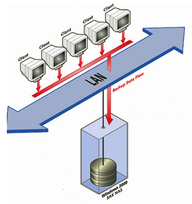 NAS作为文件服务器为IP网络上的客户机上的重要数据或需共享的数据提供存储空间。利用NAS本身具有的SnapShot(快照)功能,在NAS上可制定自动的快速备份策略,将其上的重要数据进行备份恢复。